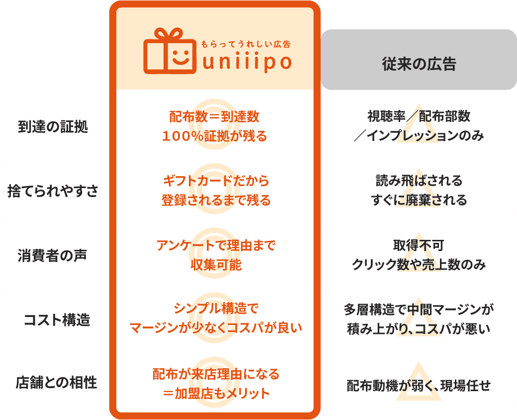 ユニーポは、お客様や社員に特別な体験を届けたいという企業様の想いと、「広告を見ない」ことが常態化した時代の課題を解決するために誕生しました。チラシがゴミ箱行きとなり、テレビCMがスキップされる時代だからこそ、広告主も消費者も嬉しくなる仕組みこそが必要だと考えております。受け取る人の“嬉しさ”を根本に置き、広告効果と体験価値の両立、そして継続的な関係構築を最も大切にしております。