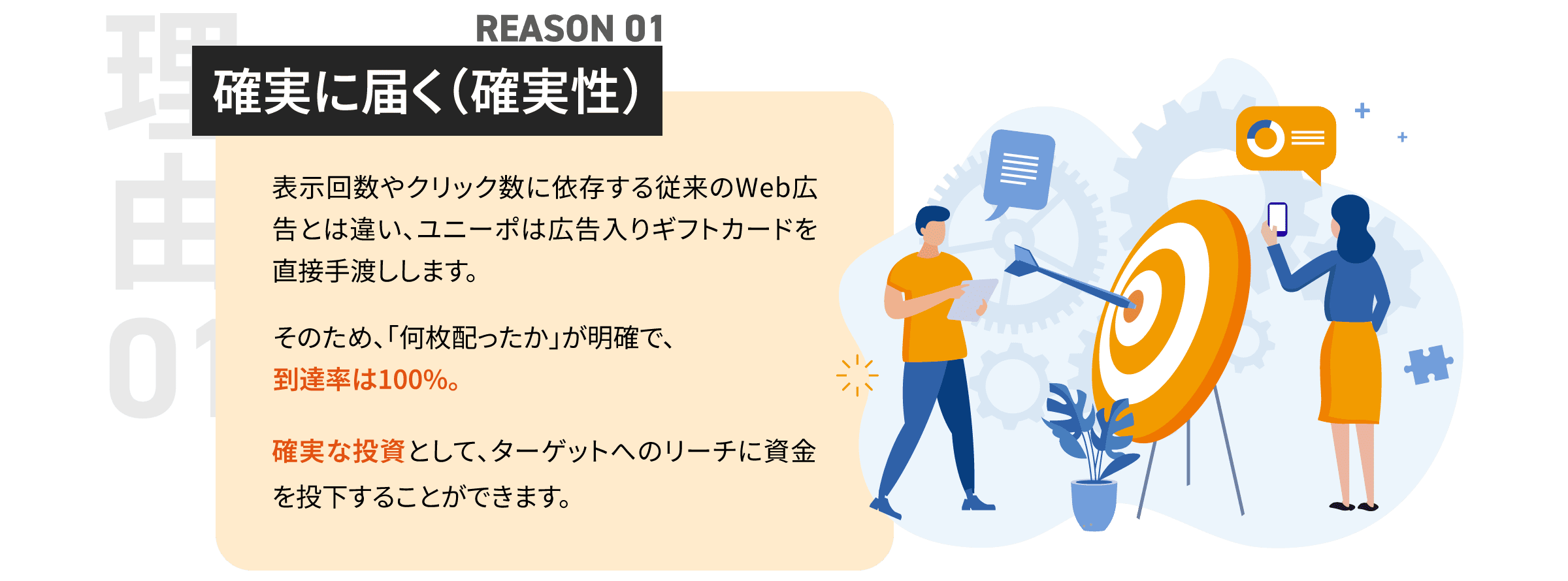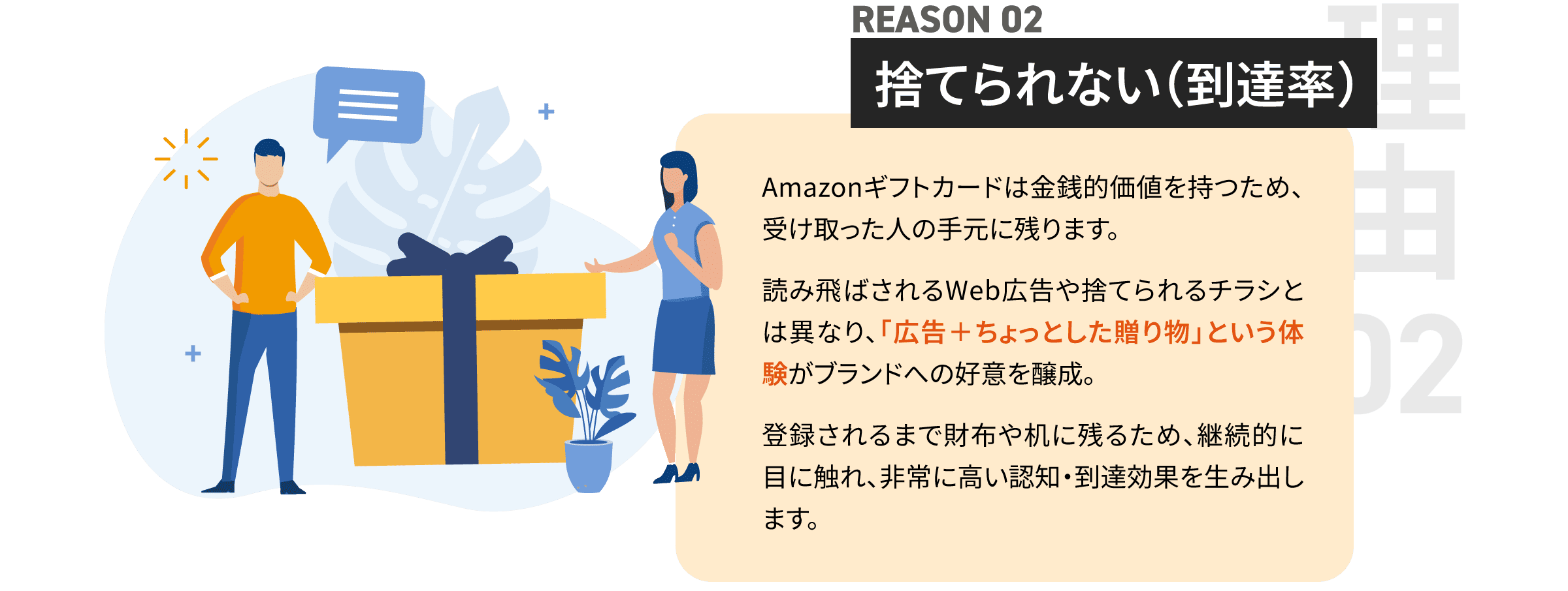 広告媒体がAmazonギフトカードのため、AmazonのWebサイトに登録されるまで捨てられてしまう可能性が低く、受け取った方に広告主のメッセージが届きます。