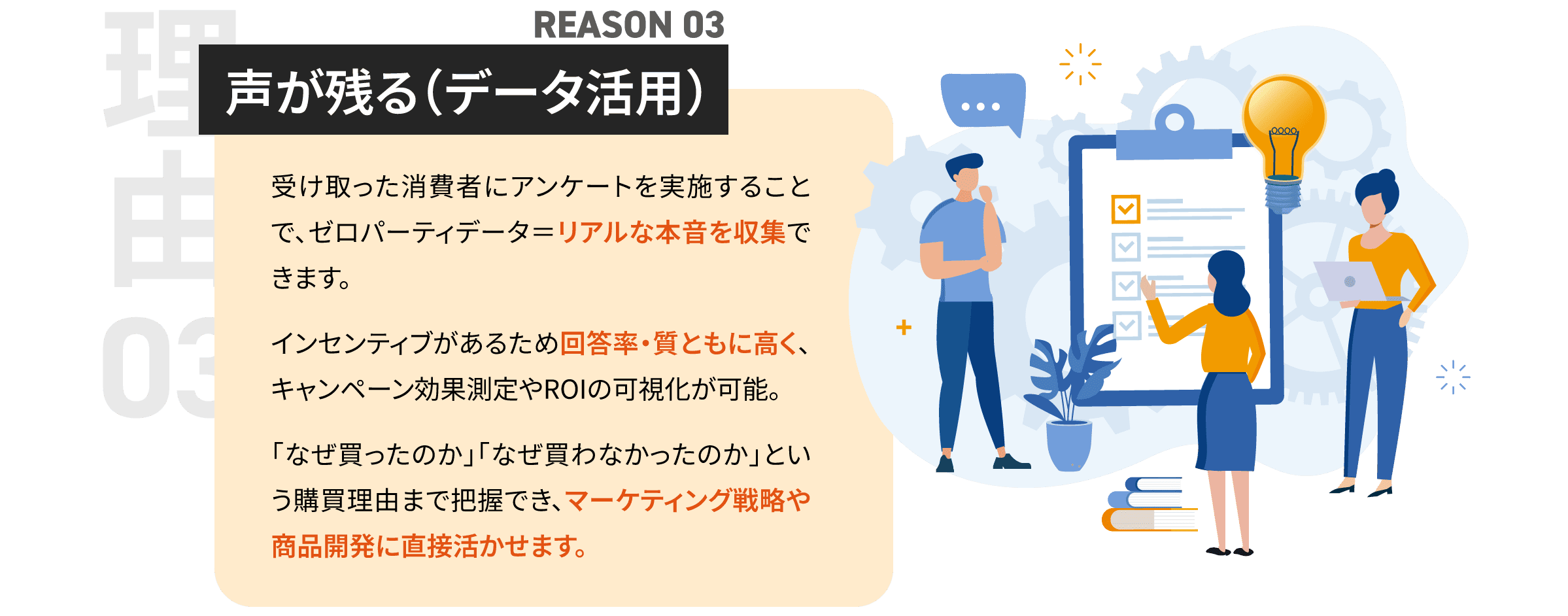 - アンケートで「選ばれた理由」「選ばれなかった理由」を把握でき、次の施策や商品改善に直結するデータが得られる