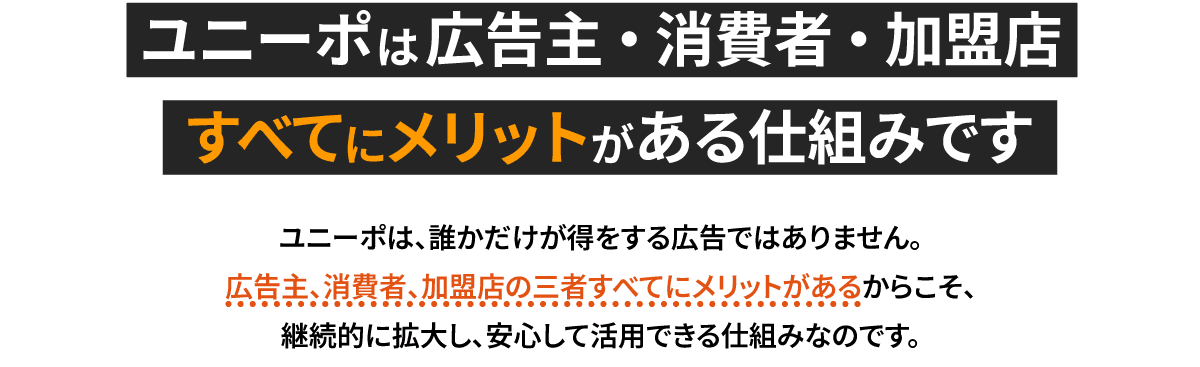 ユニーポは広告主・消費者・加盟店すべてにメリットがある仕組みです
